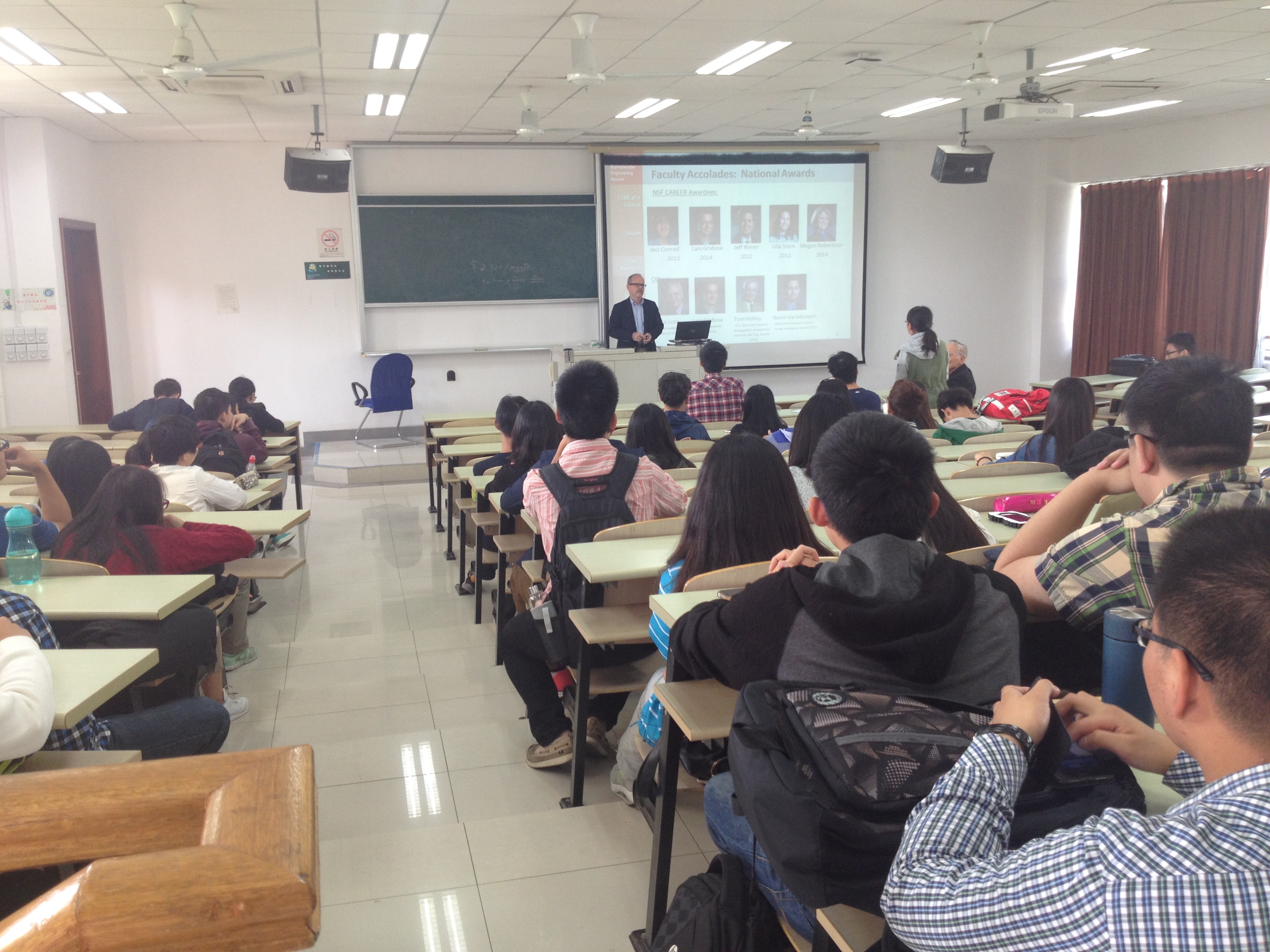 10月12日中午,美国休斯顿大学Michael P. Harold教授和Dr Dan Luss来到奉贤校区,于D教204为tyc41183太阳成集团大一至大三学生介绍两校合作交流项目信息。tyc41183太阳成集团近80名学生参加了此次见面会。