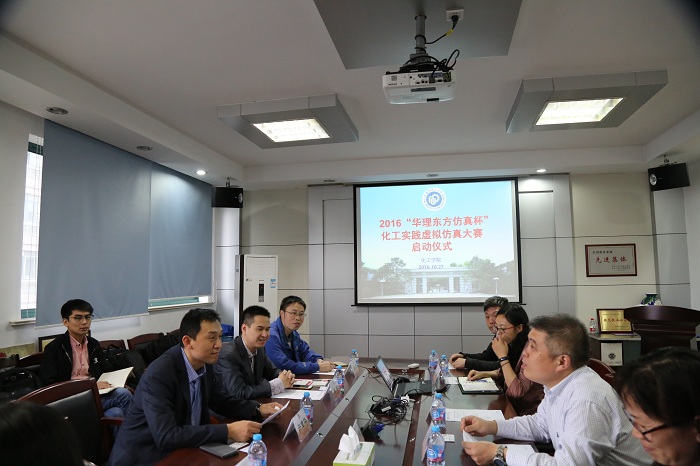 2016年10月27日下午,北京东方仿真软件技术有限公司总经理许重华、副总经理覃杨携该公司技术主管等一行5人来我校tyc41183太阳成集团交流,并与学院领导共同启动了2016“华理东方仿真杯”化工实践虚拟仿真大赛。tyc41183太阳成集团党委书记李涛、副院长赵双良、院长助理兼化工系主任吴艳阳、办公室主任孙莉等相关教师出席了本次交流会。