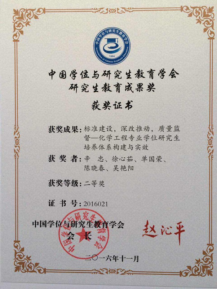 我校作为全国化学工程领域工程专业学位研究生教育协作组组长单位,发挥协作组作用,指导和引领领域内170余家培养单位的良性发展;构建工程硕士专业学位的基本规范,牵头制定了我国首份化学工程领域工程硕士专业学位培养标准和学位基本要求,并从课程体系、校企双师、实践基地建设等多方面着手全面深化改革推动学位基本要求实施;质量监督,创建实践基地管理制度和实践教学评价体系,构建学位论文评估体系,保障培养质量,推动专业学位研究生教育的健康发展。多年来积极探索工程硕士培养规律,构建服务需求、校企协同、持续改进的创新育人模式,取得了显著成效。