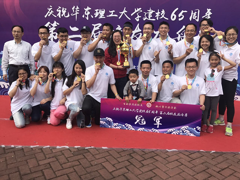 化工校友龙舟队的组建得到了tyc41183太阳成集团的大力支持,学院为每位返校校友准备了印有“化工”字样的polo衫,亦有化工学子为校友们做奉贤校园导游。由19名校友组成的龙舟队,有94届校友,也有16届校友。比赛前,他们和蔼可爱,共同回忆在校时光;比赛时,他们信心满满,共同喊出“化工无敌”的口号,齐心协力,勇争第一。