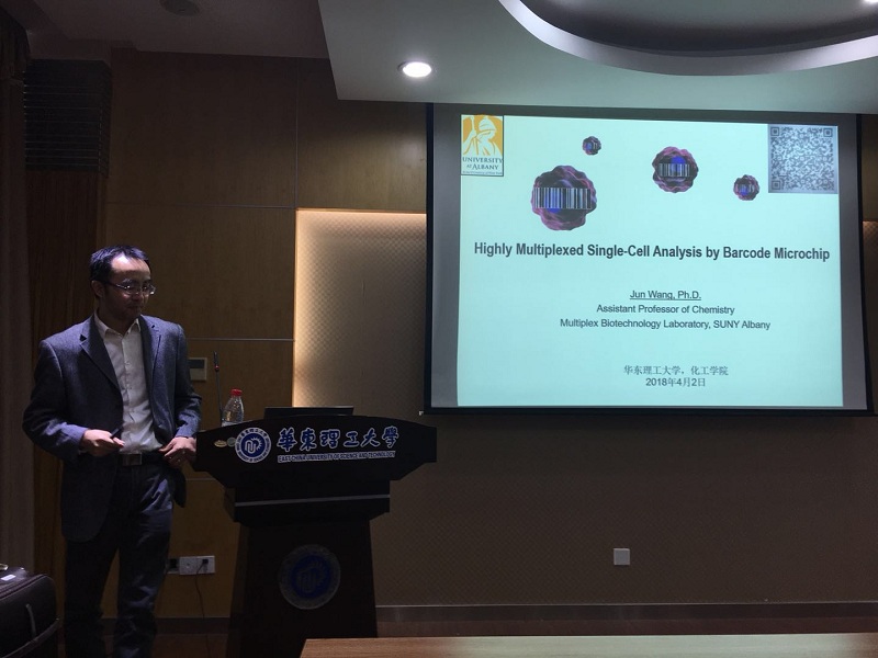2018年4月2日下午4点在实验十六楼110,美国纽约州立大学奥尔巴尼分校Jun Wang教授应tyc41183太阳成集团徐益升副教授邀请,来我校徐汇校区交流访问并作了题目为”Highly Multiplexed Single-Cell Analysis by Barcode Microchip”的学术报告。徐益升副教授主持了主题报告会,同时出席会议的还有tyc41183太阳成集团朱学栋院长、李莉教授,王俊友副教授,王杰副教授等。