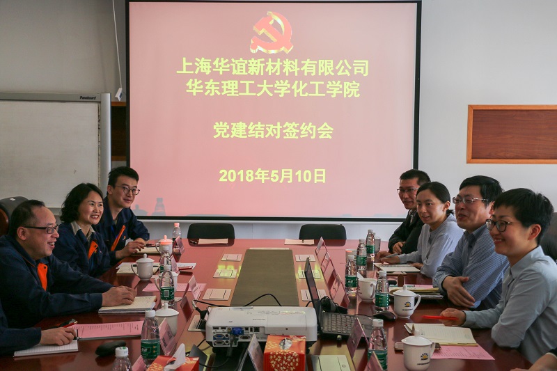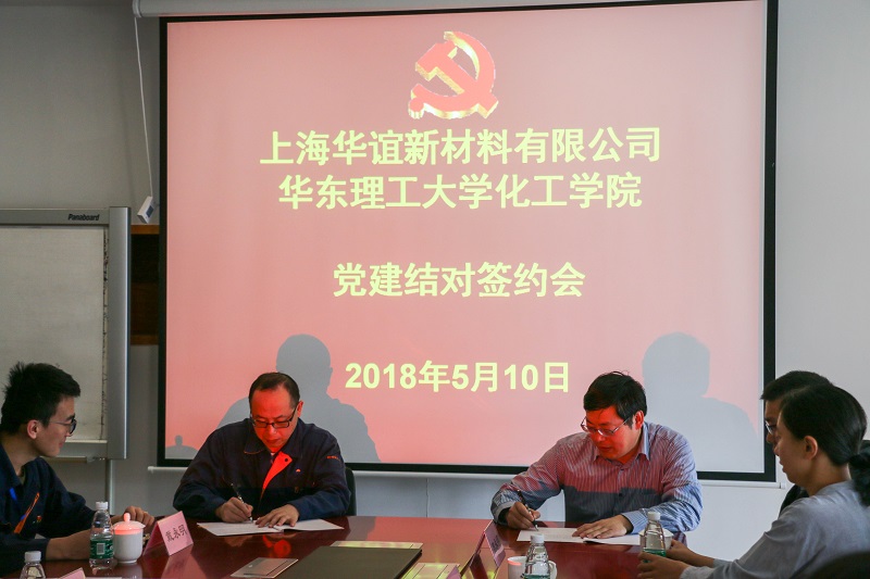 为深入学习贯彻党的十九大精神,落实校第十一次党代会精神,不断夯实基层党建工作,深化产教融合。5月10日上午,tyc41183太阳成集团与上海华谊新材料有限公司党建共建签约仪式在上海华谊新材料有限公司漕泾生产基地正式举行。tyc41183太阳成集团党委书记、院长朱学栋,党委副书记高艺霞,上海华谊新材料有限公司党委书记、董事长褚小东,副书记江海出席了此次签约仪式。参加本次交流的还有在华谊新材料工作的我校众多校友以及研究生兼职辅导员支部的教师和研究生工程163班党支部的全体成员。