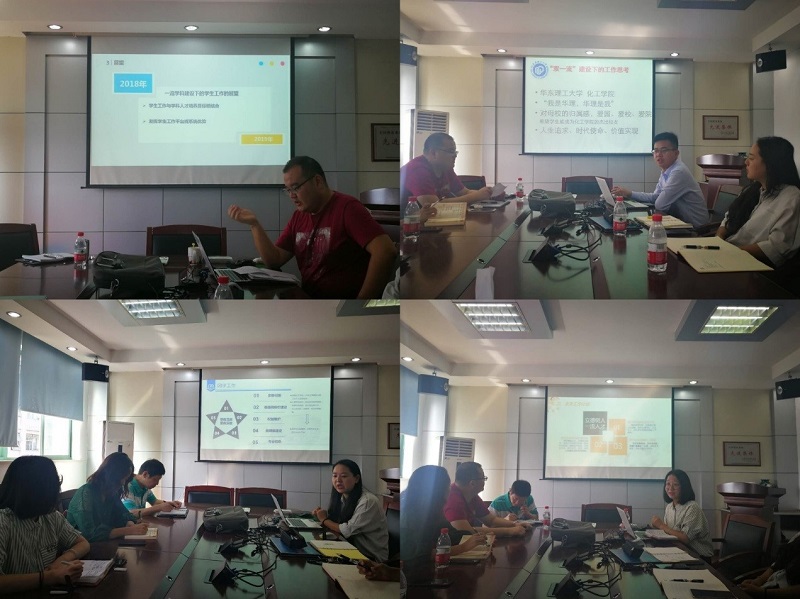 随后,辅导员依次进行研讨汇报。王梦雪总结了上学年团委工作,对本学期就业工作做出规划,明确了校友工作对于学生归属感以及未来发展的重大意义;刘宗慧围绕忧患意识、安全宣传、家校协作三个方面对接下来的安全稳定初步规划;强莉提出了一流学科建设背景下推动学生工作法治化的工作思考,促进学生工作规范化、制度化建设;姜贤武强调了“文化育人,志愿育人”理念,打造有华理化工特色的品牌京剧,建设有温度有责任的华理化工志愿者团队;阿曼围绕少数民族学生学风建设的重要性进行发言,未来将进一步挖掘少数民族学生优秀典型;研究生辅导员于靖和庞祎晔汇报了研究生基层党建工作,并提出贯通研究生和本科生基沟通交流渠道,加强两校区联动、传承的工作理念。