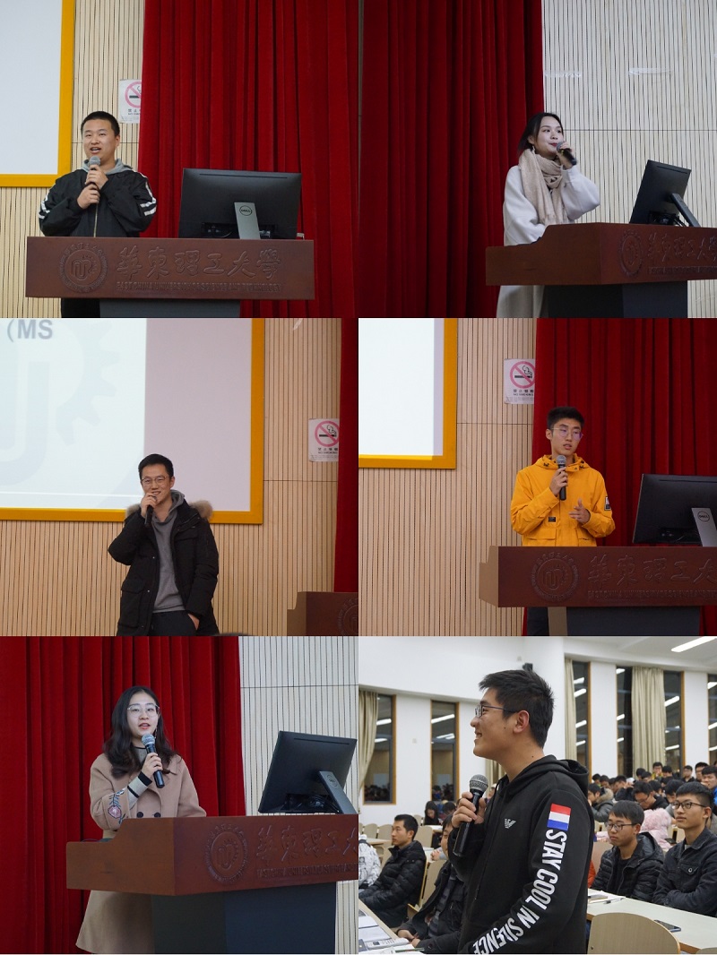 袁野、周文韬为同学介绍华理化工的就业情况。他们告诫大家,要根据自身的实际情况,在就业与深造之间做出合理选择,不要盲目从众,应跟随自己的内心。在讲到关于企业面试技巧方面时,袁野就案例准备、面试技巧等方面谈了自己的意见与感悟。周文韬还建议大家利用课余时间广泛阅读,拓宽自身的知识广度,提高核心竞争力。