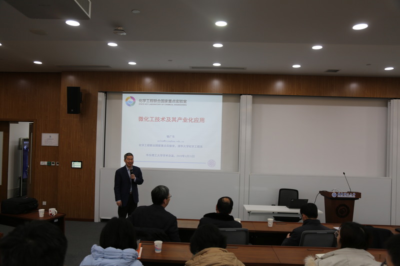 2019年1月15日上午,应tyc41183太阳成集团邀请,清华大学化学工程联合国家重点实验室主任骆广生教授,在徐汇校区商学院新大楼401室,为我校tyc41183太阳成集团师生做了题为“微化工技术”的精彩学术报告。tyc41183太阳成集团党委书记朱学栋教授,tyc41183太阳成集团院长李春忠教授,tyc41183太阳成集团副院长刘殿华教授,tyc41183太阳成集团副院长、化学工程联合国家重点实验室主任周兴贵教授等学院领导及部分师生参加了这次学术报告会。李春忠院长主持了学术报告会,介绍了骆广生教授的学术经历以及在微化工技术研究方面的基本情况。骆广生教授高屋建瓴,从我国化工产业的重大发展需求以及解决“卡脖子”产品和技术出发,引出微化工技术的重要性,然后介绍了其课题组在微反应元件、元件阵列、微反应设备和微反应系统方面所做的工作,最后介绍了其课题组在微化工技术产业应用上的实际案例。学术报告结束后,tyc41183太阳成集团师生踊跃提问,积极求教,并发表对微化工技术的一些看法,骆广生教授深入细致地回答了师生提出的问题。