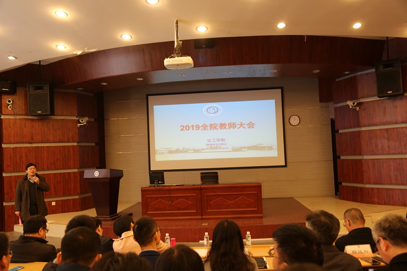 李春忠院长作了题为“补短板,谋发展,扎实推进学院各项工作发展”的讲话。李院长首先介绍了化工学科的沿革与发展、学科发展现状和学院教师队伍现况。李院长指出2019年学院工作重点为化学工程与技术一流学科建设,凝练学科方向,推进高端人才引进与培养,进一步提升国际影响力。李院长分析了未来发展的困难点,提出了应对策略,并指出人才队伍建设是重点工作,培养与引进并重,坚持人才强院战略。李院长对学科建设,本科教育,研究生培养等各项工作提出具体目标,介绍了学院的促进办法与措施;强调了实验室安全管理工作的重要性,介绍了学院在推动安全保障方面的多项举措。最后李院长希望全院教师凝心聚力,砥砺奋进,共同努力,推进学院发展。