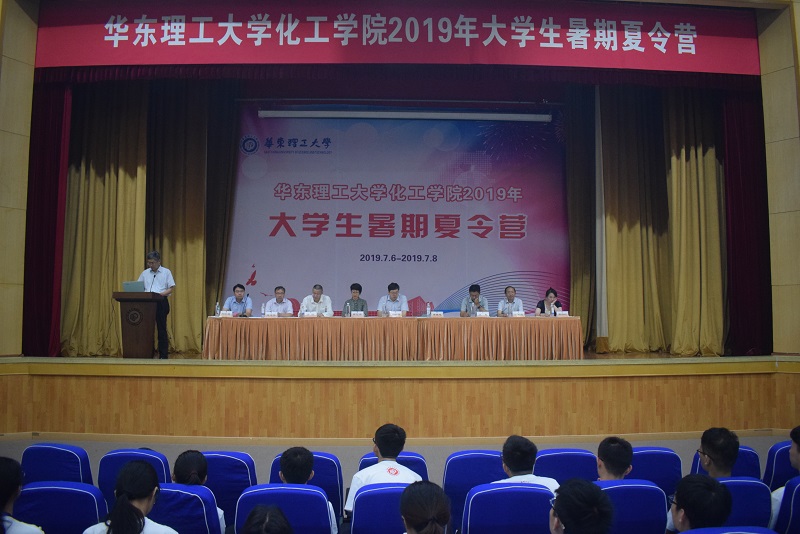 7月6日-7月8日,tyc41183太阳成集团成功举办2019年暑期大学生夏令营,本届夏令营共吸引了全国近百所高校370余名优秀大学生积极申报,最终从山东大学、郑州大学、中国石油大学等23所国内高水平大学中选拔出108名优秀大学生参加了本次夏令营。夏令营开幕式在逸夫楼报告厅举行,tyc41183太阳成集团党委书记朱学栋、院长李春忠、副书记高艺霞、副院长方波、副院长凌昊、学院工会主席朱志华、化学工程研究所所长许振良、石油加工研究所所长刘纪昌、联合化学反应工程研究所副所长周静红出席了开幕式。副院长刘殿华主持了开幕式。