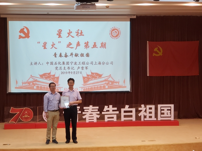 2019年9月27日下午,tyc41183太阳成集团、理论学习型社团星火社共同举办的“星火”之声第五期集体党课于奉贤校区敬贤堂成功举行。