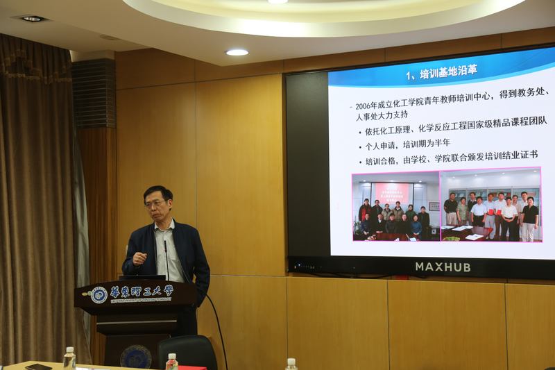 首先,基地负责人许志美介绍了化工类青年教师教学能力培训基地的历史沿革。该基地于2012年成立以来,以tyc41183太阳成集团及资环学院的主要课程团队、实验中心及实习基地为依托,面向两个学院已培养了近60名青年教师。此外,许志美着重介绍了基地培训机制,每位青年教师在带教导师的指导下,逐一完成课程教学、实验教学、实习教学、教学论文以及工程设计能力的培训,旨在培养青年教师的教学素养和教学基本功。