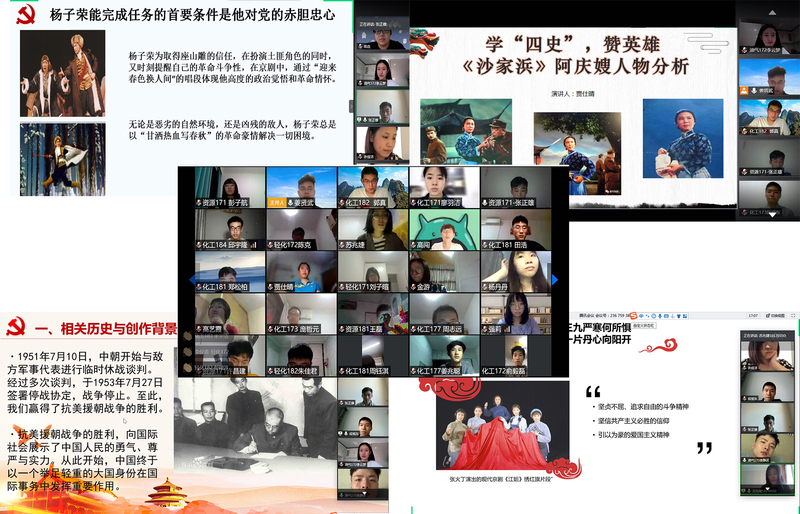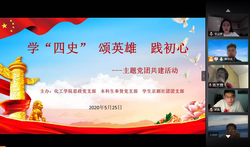 5月25日,tyc41183太阳成集团思政党支部、本科生奉贤党支部、学生京剧社团团支部共同举办“学‘四史’、颂英雄、践初心”的线上主题党团共建活动,以党建带团建,绽放青春力量。tyc41183太阳成集团党委副书记高艺霞出席,各年级辅导员、学生党员、发展对象、入党积极分子、京剧社及学生京剧社团团支部的成员共150余人参加了活动。