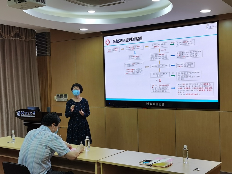 为深入贯彻落实习近平总书记关于新冠肺炎疫情防控的重要讲话精神,按照学校“预防为主,安全第一”的思想,认真做好第二批研究生集中返校后的师生安全保障工作,6月4日,tyc41183太阳成集团召开研究生返校疫情防控演练工作会议,研究生导师及实验室管理等相关工作人员参会,副院长刘殿华主持了会议。