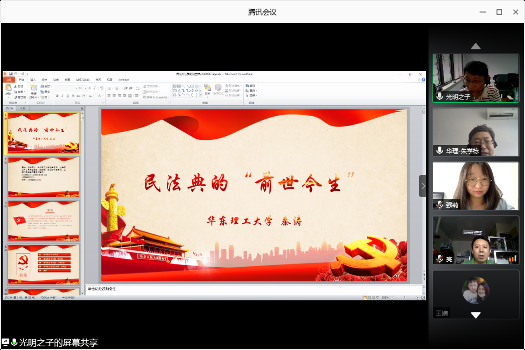 为贯彻落实校党委关于加强“四史”学习教育的部署,结合两会热点,6月18日,tyc41183太阳成集团邀请我校法律顾问、法律硕士中心常务副主任秦涛副教授为学院全体教职工作题为《民法典的“前世今生”》的专题报告。tyc41183太阳成集团党委书记朱学栋主持报告,党委副书记高艺霞、副院长方波、副院长郭旭虹以及学院103名教职工在线参加了报告会。