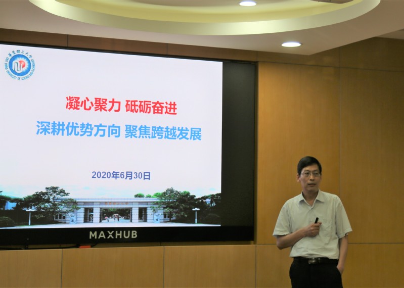 李春忠以“凝心聚力、砥砺奋进;深耕优势方向、聚焦跨越发展”为主题,结合我校化工学科的基本情况,汇报了学院“十三五”科研工作总结、2020年科研重点工作和“十四五”重点发展规划。汇报中,他提出要加快做好学院“十四五”科技创新规划,明确提出了 “十四五”时期学院科技创新的总体思路、发展目标、主要任务和重点工作。学科建设围绕高效分离与反应工程、材料化工与产品工程、智能与仿生化工三个学术方向,重点支持发展高端专用化学品、关键化工新材料、新能源器件与装备等领域;紧密对接国家重大需求,持续促进人才培养,凝聚优势科研成果,全面提升学院的社会服务能力。