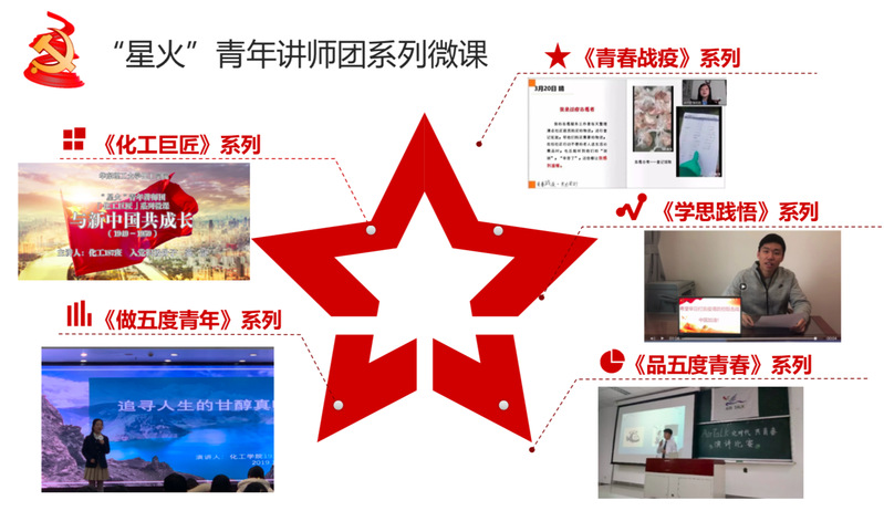 “星火”微课体系涵盖五大系列,打造立体化、多维度宣讲平台。《化工巨匠》系列微课生动展示新中国成立以来化工人辛勤耕耘的奋斗实践,深刻解读一代代化工巨匠坚守初心、忠诚使命的感人情怀和崇高精神,唱响礼赞新中国、奋进新时代的昂扬旋律;《青春战疫》系列微课化“疫情 危机”为“教育契机”,将战“疫”一线志愿者的鲜活事迹请进思政课堂;《学思践悟》系列微课展示青年先锋示范、自强奋进、知行合一、奋斗追梦的青春故事;《做五度青年》系列微课通过“高度”、“温度”、“风度”、“态度”、“亮度”五个维度展示新时代青年的综合素养;《品五味青春》系列微课“品味”酸甜苦辣咸中难忘的青春滋味;《戎装青春》系列微课则展示退伍大学生携笔从戎,在绿色军营中淬炼成长,以实际行动报效祖国的动人故事。