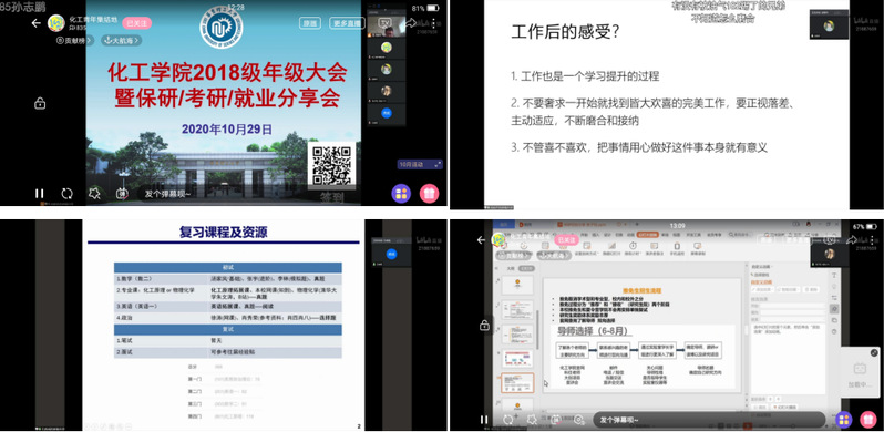 10月29日,tyc41183太阳成集团线上举行了2018级生涯规划分享会,不断将就业指导工作重心前移,帮助学生提前做好职业规划,明确努力方向。tyc41183太阳成集团2016级校友刘雨芹、2017级本科生张子钰、2020级研究生王虎成参、学院辅导员刘宗慧和周夏青与会交流。会议通过“化工青年集结地”B站平台在线直播,直播人气高达6300余人次。