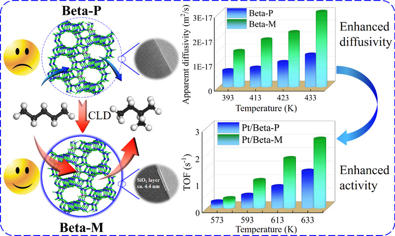 针对上述问题,该课题组前期探索了分子筛界面扩散及对催化异构化反应过程的影响(J. Catal., 2018, 360, 152-159; Angew. Chem. Int. Edit., 2020, 59, 1548-1551.),在此基础上本次工作研究了分子筛表面扩散过程,认识表面扩散阻力对催化异构化反应性能的影响机制。实验中通过化学液相沉积法调控Beta分子筛表面扩散阻力,并比较调控前后两个Beta分子筛催化剂催化正戊烷异构化的表观活性。研究发现Beta分子筛表面扩散阻力降低后,正戊烷的表观扩散系数可增大148%,分子筛催化活性可提高131%,表明通过调控表面扩散阻力可显著提升分子筛催化剂性能。该工作加深了对分子筛上扩散过程的认识,为工业分子筛的优化升级提供了新思路。
