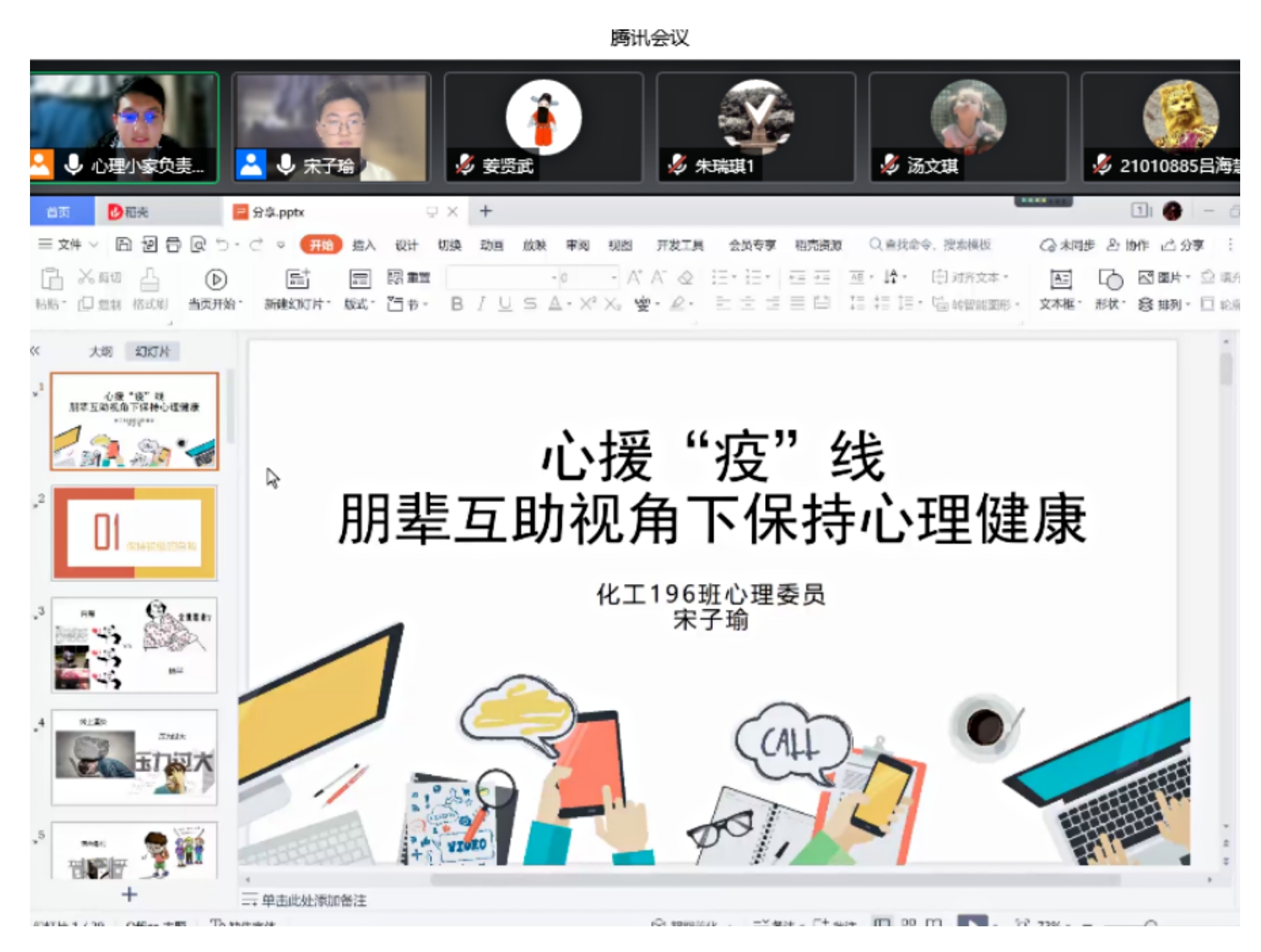 于此同时,学院心理小家还举办了“心援‘疫’线,朋辈互助视角下保持心理健康”主题活动。第三届全国百佳心理委员化工196班宋子瑜分享了疫情下如何自我关怀、保持积极的心态以及发挥朋辈的力量。活动吸引了近200名同学参与。