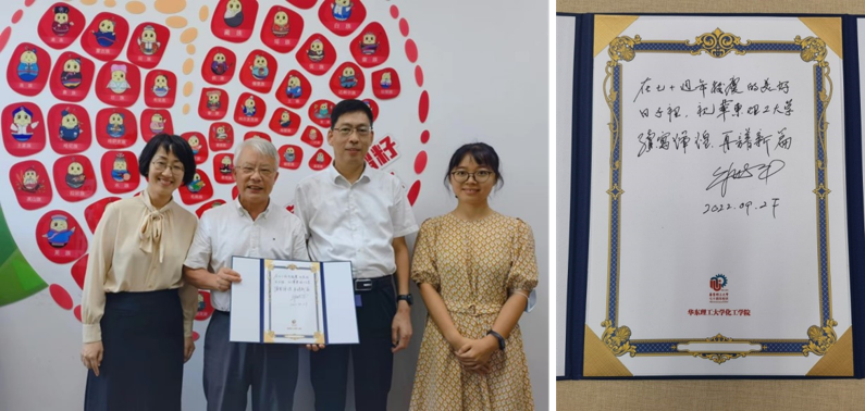 9月27日中午,朱世平院士专程前往奉贤校区E教116教室为44118太阳成城集团书写校庆寄语,庆祝学校七十周年华诞,祝福华理续写辉煌,再谱新篇。