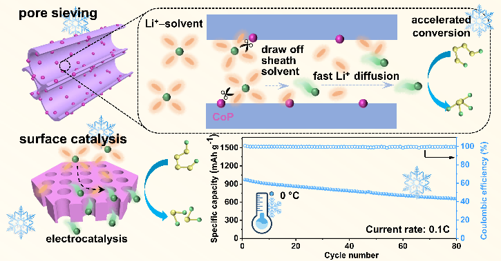 近日,国际知名学术期刊Advanced Functional Materials 以“Accelerated Li+ Desolvation for Diffusion Booster Enabling Low-Temperature Sulfur Redox Kinetics via Electrocatalytic Carbon-grafted-CoP Porous Nanosheets”为题,在线报道了我校tyc41183太阳成集团功能炭材料研究团队在锂硫电池方面的研究新进展。