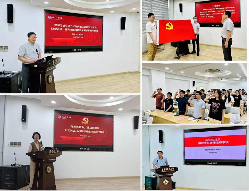 接受一次党性教育、再悟初心。6月15日上午,tyc41183太阳成集团毕业生党员齐聚一堂,以集体宣誓的方式,重温入党誓词,接受了一次深刻的党性教育。面对鲜红的党旗,tyc41183太阳成集团党委书记朱学栋带领全体党员,举起右手,紧握拳头,在党旗下宣誓,重温入党时的神圣和庄严,再悟初心。会上,朱学栋领学《习近平总书记在内蒙古调研时对抓实以学正风、解决突出问题的有关要求和指示精神》,从“大兴务实之风”“弘扬清廉之风”“养成俭朴之风”三个方面勉励全体毕业生党员要时刻牢记党员身份,在未来的学习与工作中既仰望星空,又脚踏实地,做一个求真、求是、求实的新时代好青年。学院党委副书记高艺霞围绕“科技报国、人才强国”寄语毕业生党员:牢记入党初心、常怀感恩之心、砥砺报国之志,用自己的学识和技术,解决国家发展中的“卡脖子”技术难题,以实际行动践行自己的初心使命。学院组织员梅海东就毕业生党员组织关系转接工作流程和注意事项进行了详细讲解,希望大家将及时做好组织关系转接作为增强党性观念的重要一环。