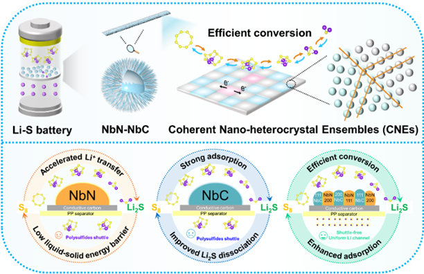 图片说明:共格纳米异质晶群CNEs的制备及在Li-S电池中的作用机制示意图