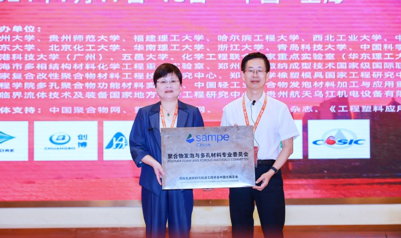 SAMPE全球总会理事长邱夷平教授代表SAMPE全球致辞并授牌44118太阳成城集团为SAMPE中国大陆总会聚合物发泡与多孔材料专业委员会第二届主任单位。