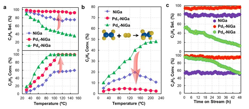 为此,研究团队针对具有完全隔离Ni位点的NiGa金属间化合物催化剂,利用双层金属氢氧化物材料(LDHs)的层间阴离子可交换性和结构拓扑转变特性,在NiGa金属间化合物表面嵌入单原子Pd,并借助球差电镜、X射线吸收光谱等结构表征和理论计算对催化剂结构进行解析,证实Pd物种是以单原子的形式嵌入至NiGa金属间化合物中原有Ga位点上,形成了具有Pd1Ni2Ga1集团位点的Pd1-NiGa催化剂。结合吸附构型解析、电子结构分析、原位红外光谱表征等机理研究手段,发现单原子Pd与Ga隔离的邻近Ni位点协同作用,实现了其与表面关键物种的构型匹配,促进了反应物炔烃的σ-吸附和氢气的解离,同时促进了目标产物烯烃的脱附,预示其具有优异的催化加氢性能。催化反应性能评价进一步表明,Pd1-NiGa催化剂在乙烯和丙烯选择性超过96%时,乙炔和丙炔加氢活性均明显高于目前已报道的炔烃加氢催化剂。可见,单原子Pd与邻近Ni位点的协同作用在NiGa金属间化合物上展现出“点石成金”(Midas touch)的效果,为进一步设计高性能低碳炔烃加氢催化剂提供新的思路。