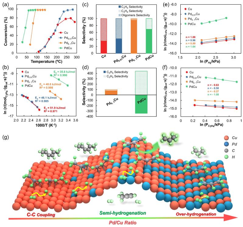 多相催化加氢技术广泛应用于大宗化学品和精细化学品的生产。然而,由于反应物/中间体不利的构型往往导致反应路径调控困难,制约了高效加氢催化剂的设计。近年来,随着先进表征技术与理论模拟方法的协同发展,研究者逐渐认识到通过原子级精准调控活性位点的配位微环境,可实现对反应物吸附构型及加氢路径的定向调控,这为突破传统催化剂的性能瓶颈提供了新思路。丙炔加氢是制备聚合级丙烯过程的关键,其复杂的串并联反应网络涉及目标产物丙烯的生成、过度加氢副产物丙烷的形成以及偶联反应生成绿油前驱体等多个竞争路径。Cu催化剂虽可避免过度加氢,但因氢气活化能力弱,易引发偶联副反应;而Pd基催化剂虽活性高,却因丙烯吸附过强导致选择性不足。如何通过调控催化剂活性位点结构,平衡氢气活化与丙烯脱附,是提升催化性能的核心难题。