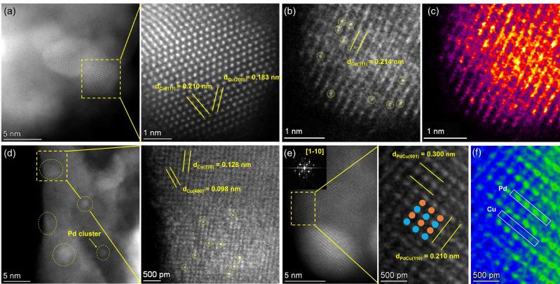 为此,研究团队通过精确调控Pd/Cu比例,成功构筑了Pd单原子修饰的Cu表面、Pd团簇位点修饰的Cu表面以及PdCu合金等不同局域环境的活性位点。催化性能测试、动力学分析和程序升温实验表明:Pd团簇位点的存在可直接催化原本发生在Cu位点上的丙炔加氢反应,同时促进氢气解离活化和目标产物丙烯脱附,催化剂在丙炔完全转化时丙烯的选择性高达95.3%。相比之下,经Pd单原子位点调变的Cu表面(与原始Cu催化剂的本征Cu位点相似)更易发生偶联副反应,而PdCu合金催化剂上由于丙烯的强吸附而易发生过度加氢反应。这些结果表明,本文构建的双金属协同催化体系,通过利用Pd和Cu位点各自优势,在提升加氢活性的同时可有效抑制深度加氢与偶联副反应的发生。论文研究工作为通过催化剂活性位点局域环境精准调控关键物种吸附构型和炔烃加氢反应路径提供新的思路,也为多相加氢催化剂理性设计提供借鉴。