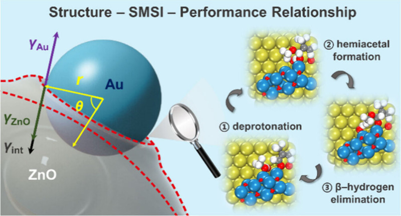 金属-载体之间的“化学默契”长期以来被视为催化科学的核心谜题之一。近日,我校tyc41183太阳成集团、化学工程与低碳技术全国重点实验室段学志教授、陈文尧特聘研究员等,首次揭示了金属-载体强相互作用(SMSI)的“钟形”尺寸依赖性规律,并基于此设计出高性能的金-氧化锌(Au/ZnO)催化剂,显著提升了氧化偶联反应的效率与选择性。相关成果以“Taming Strong Metal-Support Interactions to Generalize Gold–Zinc Oxide Catalysts in Oxidative Coupling”为题发表于《美国化学会志》(J. Am. Chem. Soc. 2025, 147, 9, 7829–7839)。