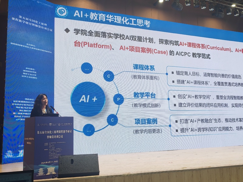 本届会议以“AI背景下的化工原理教学改革”为核心主题,汇聚了来自清华大学、天津大学、四川大学、南京工业大学及我校等全国60余所高校的专家学者。南京工业大学管国锋教授、厦门大学李清彪教授、清华大学余立新教授、南京理工大学钟秦教授、天津大学夏淑倩教授等多位专家作专题报告。我校tyc41183太阳成集团副院长吴艳阳教授在会上作了题为“人工智能赋能‘化工原理’一流课程建设的路径探索”的特邀报告,系统介绍了我校在化工原理课程中引入AI技术、推动教学数字化转型的先进经验与创新成果,展示了我校在一流课程建设与工程教育改革方面的引领性工作,引发与会代表的广泛关注和热烈讨论。
